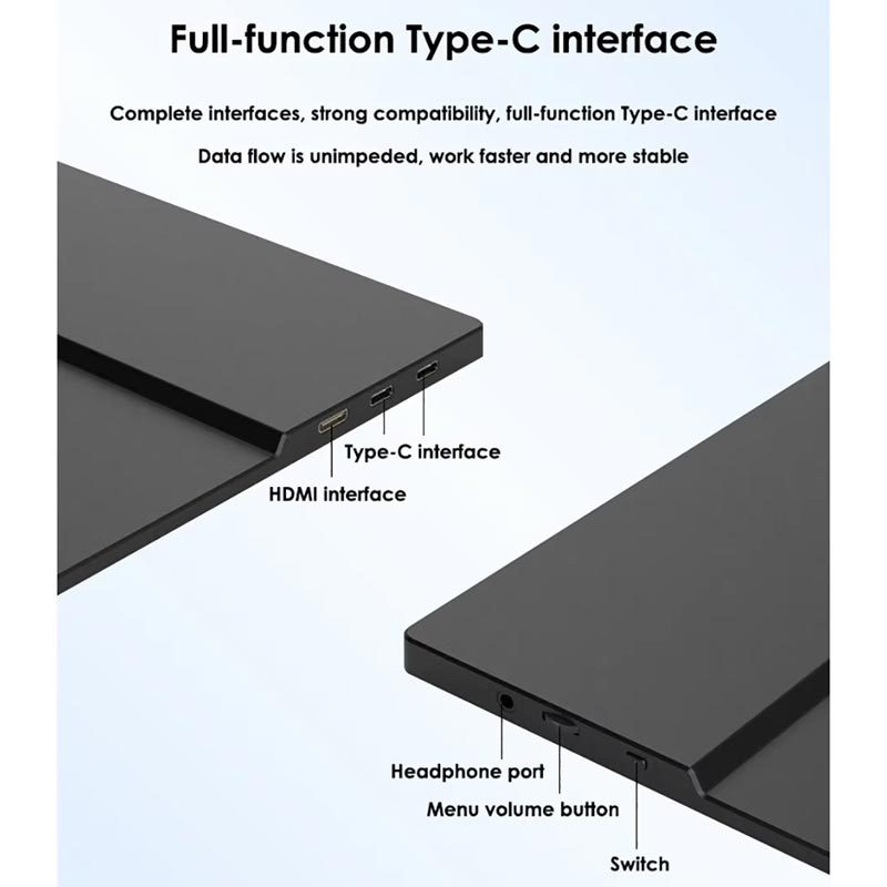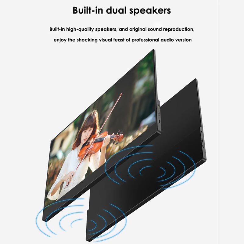Màn hình hiển thị di động này được trang bị loa kép tích hợp để cung cấp âm thanh mà không cần thêm phụ kiện. Các kết nối bao gồm MiniHDMI, Type-C và giắc cắm tai nghe 3,5 mm.